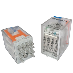 AE-407DLTU Реле 5А, 4С, катушка 220VDC, светодиод + тестовая кнопка, полярность катушки -A1 (13)/+A2 (14)