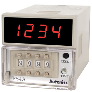 FS4A Счетчик (прямой и обратный счёт), механич. уставка, и 8 конт. штекер. Индикатор 4 цифры, размер 48x48x85 мм, питание 12-24VAC/DC, вход NPN (без напряжения), Одна уставка, выход Реле 1НО 250В 3А