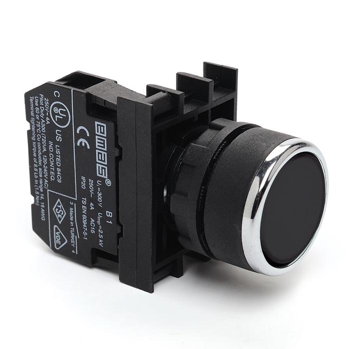 B100DH Кнопка нажимная круглая Ø22 мм. без фиксации, черная (1НО) IP50