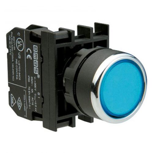 - B100DM Кнопка нажимная круглая Ø22 мм. без фиксации, синяя (1НО) IP50, с возможностью подсоединения блок контакта подсветки