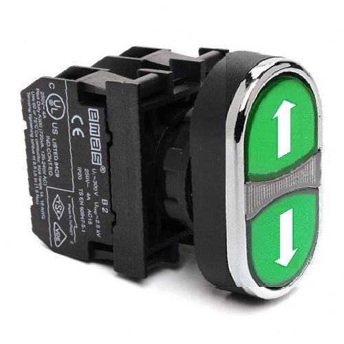 - B101K20YYOK Кнопка печатная нажимная, сдвоенная зеленая со стрелками (1НО+1НО)