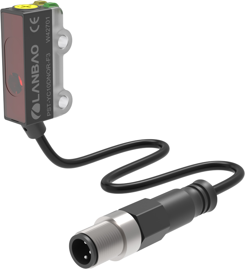 PST-YR15DNOR-F3 Фотодатчик диффузного отражения 15 мм, красное пятно, NPN, NO, 10…30 DC, ABS, прямоугольный, кабель PVC с разъемом M8 3-pin, IP67