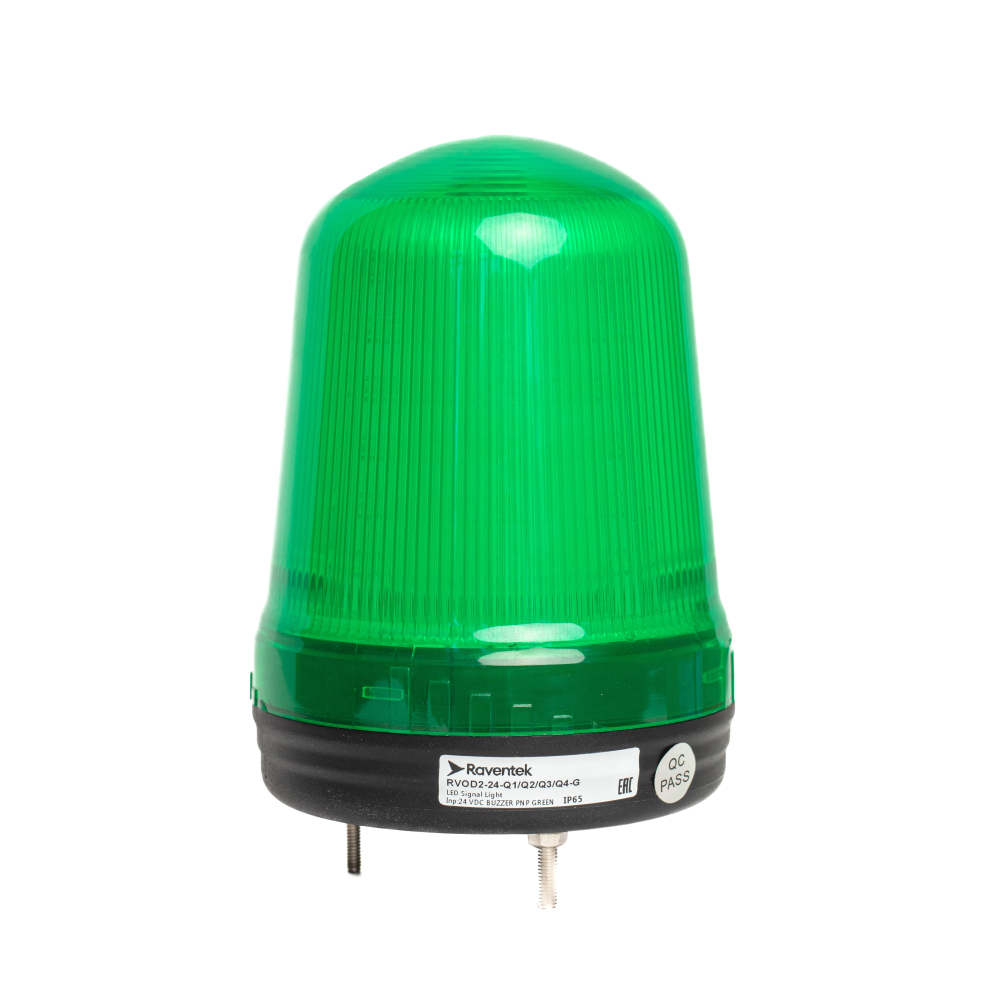 RVOD2-24-Q1/Q2/Q3/Q4-G Проблесковый маячок Raventek, Режимы свечения: Постоянное свечение + Мигающее свечение + Вращение + Зуммер, диаметр 100 мм, Зеленый, Питание 12-24VDC, IP65