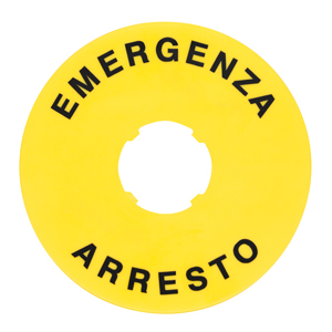 - LPXAU112 Пластиковый диск для грибовидных кнопок серии LPC…LPS, диаметр внешний 90мм, цвет желтый, надпись "EMERGENZA ARRESTO"