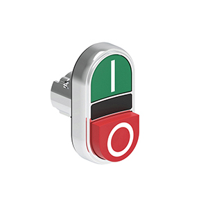 - LPSB7223 Двойная кнопка нажатия с одной выступающей и одной утапливаемой кнопками без фиксации, цвета зеленый-красный с символами I-O, (без крепежного основания LPXAU 120M)