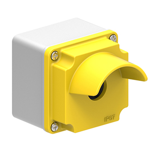 - LPZM1A5P Корпус для пультов управления на 1 кнопку d=22 мм, металл, желтый, с козырьком, 80х80х108 мм