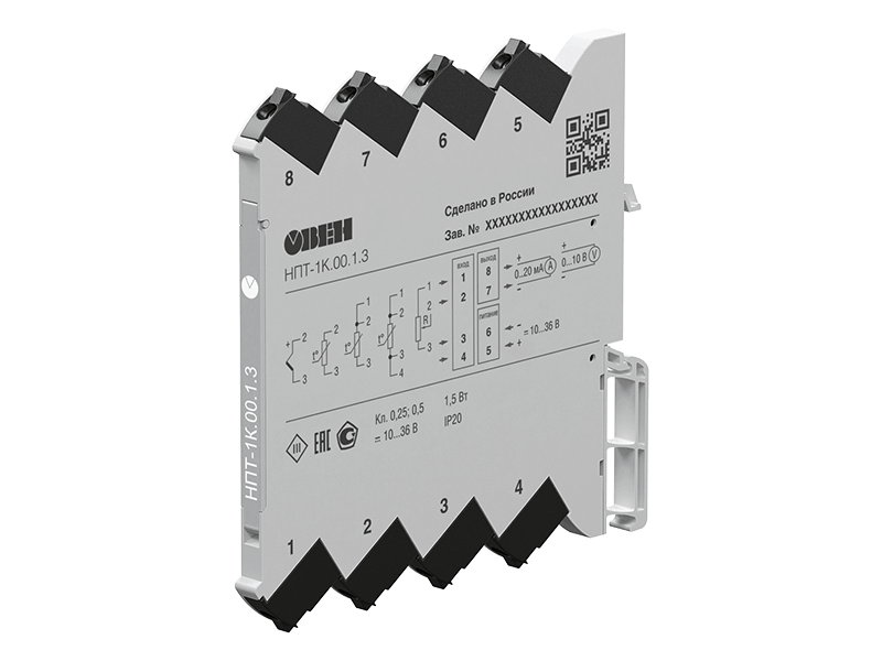 - НПТ-1К.00.1.3 Нормирующий преобразователь на DIN-рейку, питание =24 В, выход 0(4)…20 мА, 0(2)…10(5)В