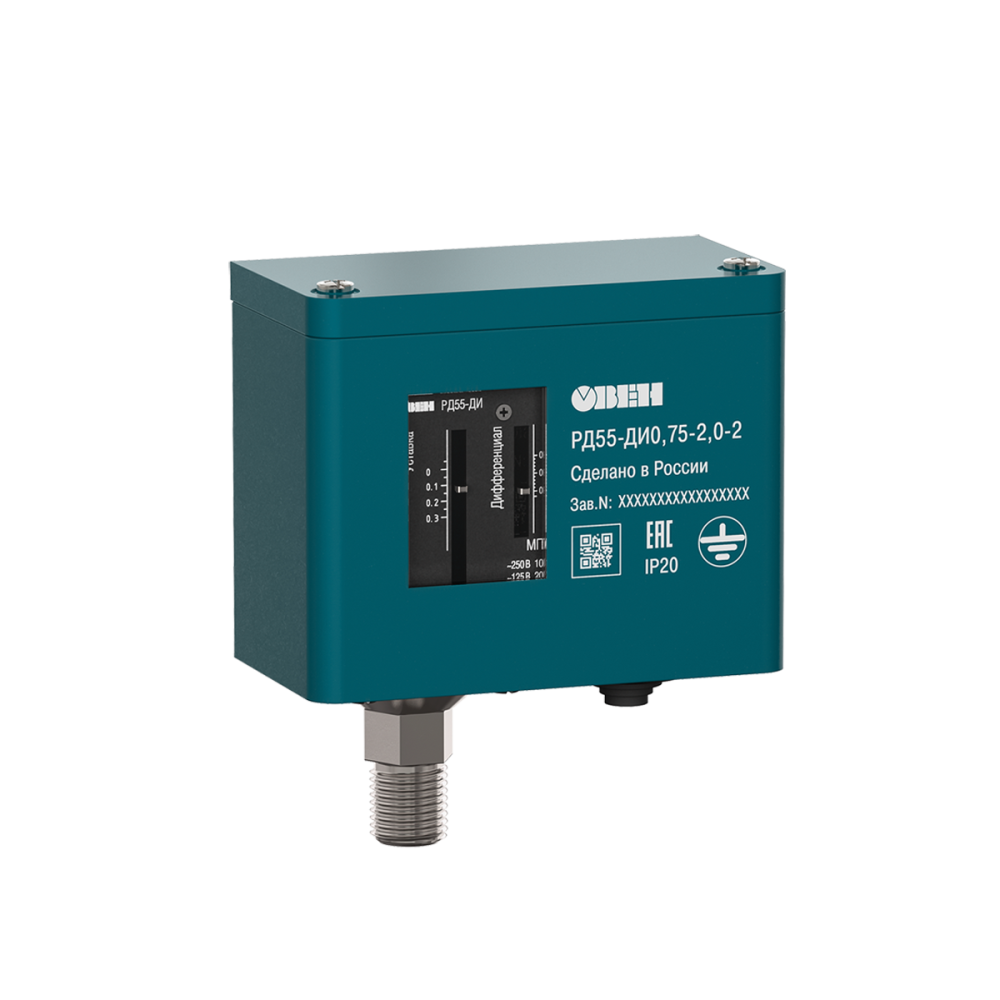РД55 представляет собой механическое реле перепада давления для коммутации электрических цепей в зависимости от изменения разности двух давлений измеряемой среды. Принцип действия реле состоит в сравнении двух давлений, подаваемых с двух сторон на сильфон, который, деформируясь, переключает однополюсный перекидной контакт. Порог срабатывания реле настраивается пользователем.Реле давления РД55 применяется для контроля работы насосов и отслеживания перепада давления в системах водоснабжения, ИТП, ЦТП, котельных, компрессорной технике и многих других установках и системах.