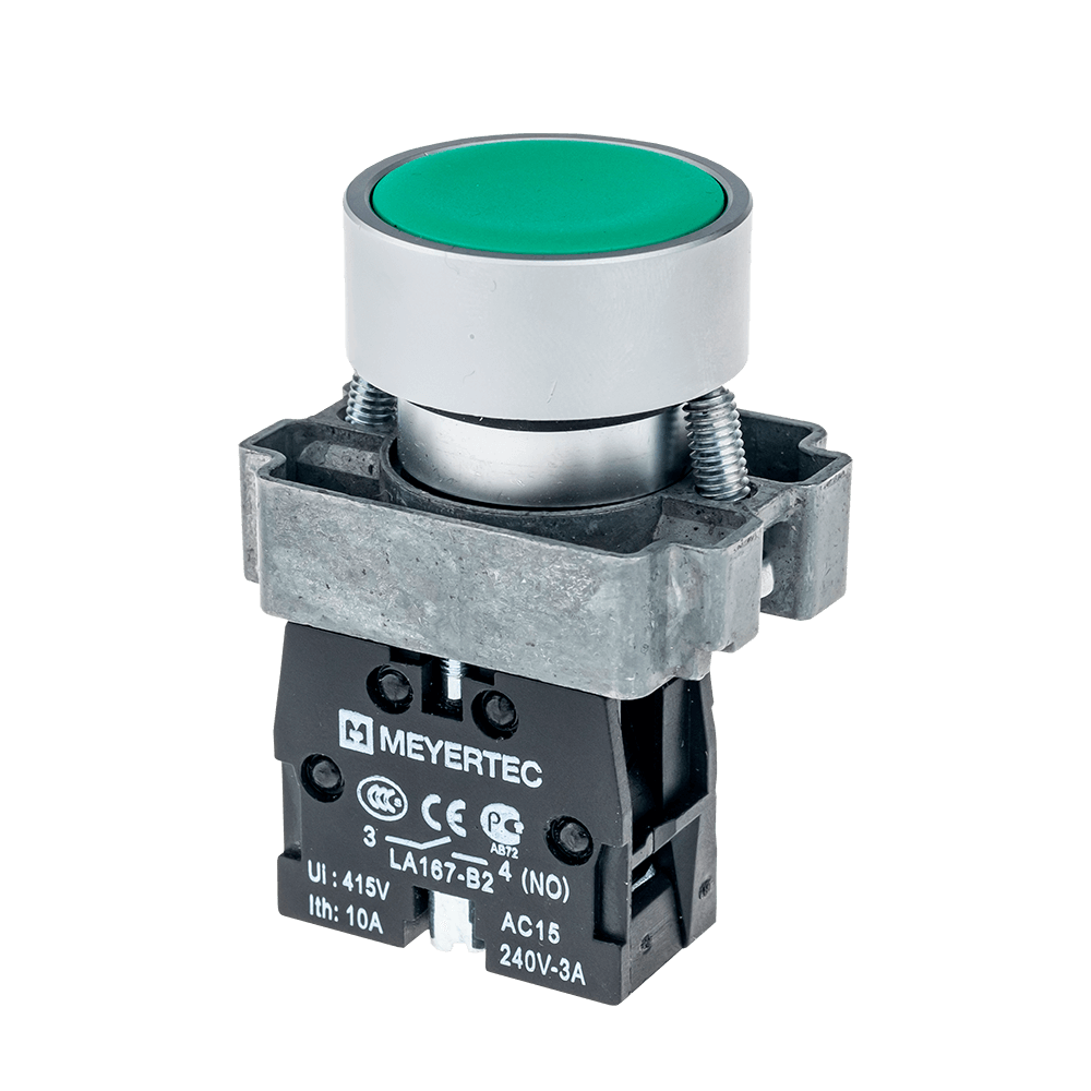 - MTB2-BAZ113 Кнопка плоская, зеленая, 1NO, металл