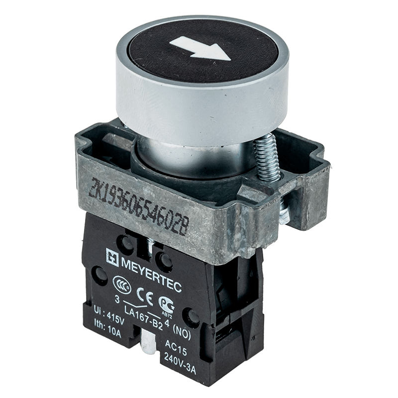- MTB2-BAZ11335 Кнопка плоская с маркировкой, черная, знак "стрелка вверх", 1NO, мет.