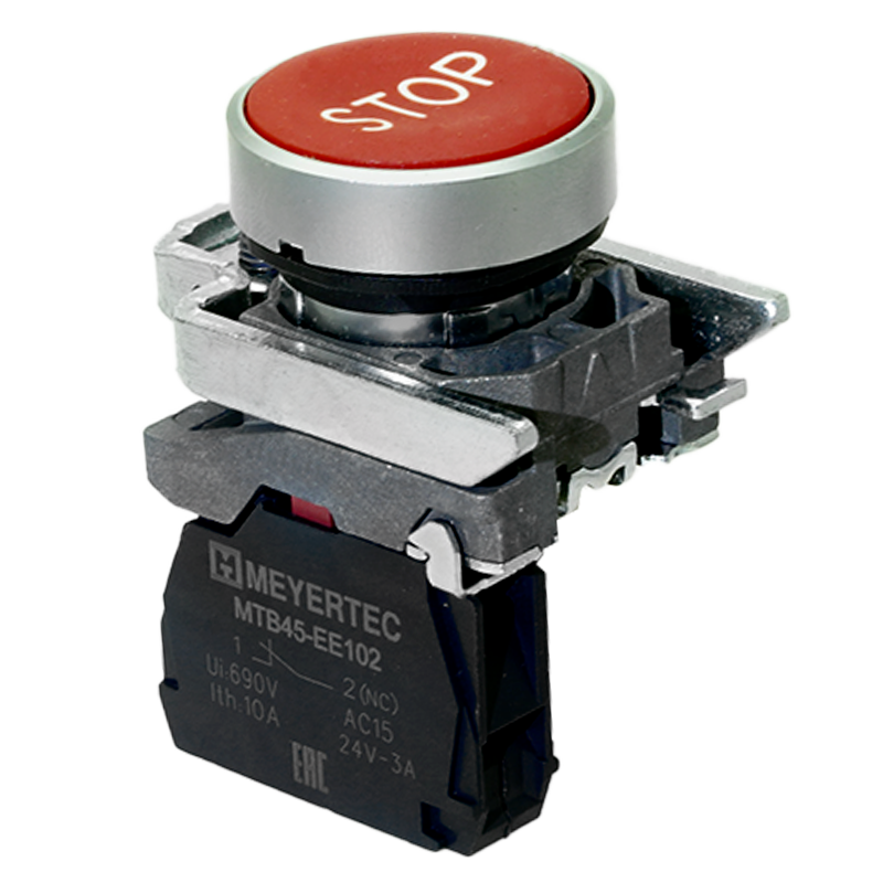 - MTB4-BA41622 Кнопка плоская красная, маркировка "STOP", 1NС, IP65, металл