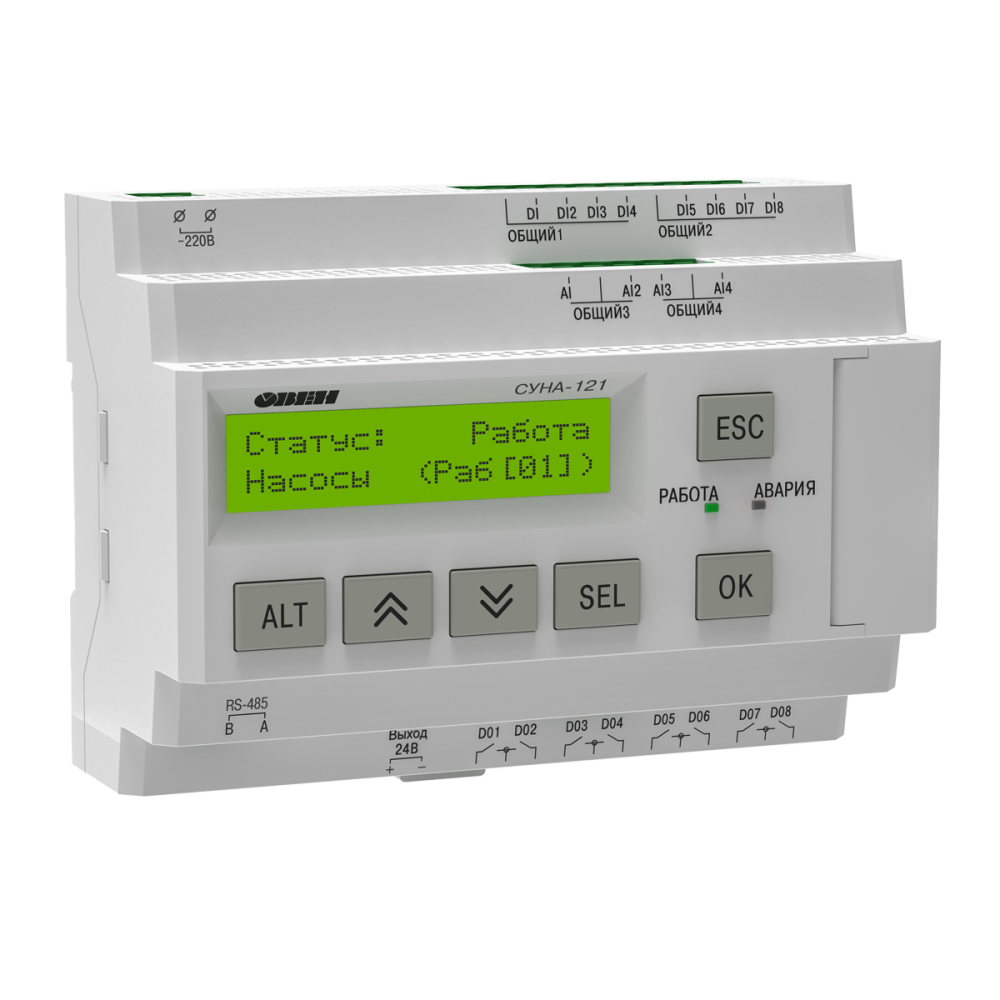 СУНА-121 - контроллер с готовыми алгоритмами для управления насосными группами. Предназначен для применения в системах водоснабжения, водозабора, повышения давления, канализационных сооружений и прочих объектов, на которых требуется управление насосами.