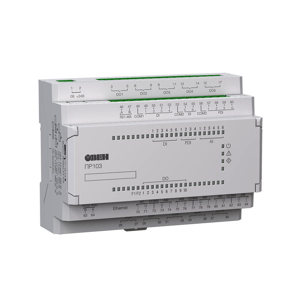 ПР103 – это первое программируемое реле ОВЕН с Ethernet на борту. Предназначено для управления вентиляцией, отоплением, насосными группами и другим оборудованием. Наличие интерфейса Ethernet позволяет интегрировать прибор в распределенные системы, реализовать удаленный контроль и управление оборудованием с помощью сервиса OwenCloud. В ПР103 может быть до 2-х интерфейсов RS-485 на борту для передачи данных на верхний уровень.