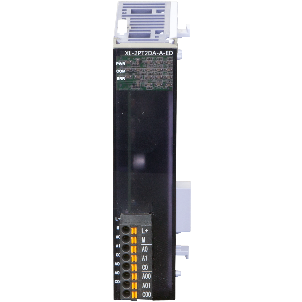 XL-2PT2DA-A-ED Модуль расширения левосторонний, 2CH Pt100 (разрешение 0.1 градуса, -100~500 градусов); 10bits, 2CH аналоговых выхода (Ток 0~20мА, 4~20мА)